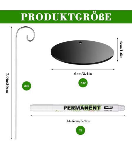 Contenu de la livraison : 30 stylos d'étiquettes + 30 cartes acryliques + 1 stylo Forme et taille parfaites : les brochettes ont une longueur pratique d'environ 20 cm et les ardoises ont un diamètre de 6 cm. Ces étiquettes pour plantes offrent suffisamment d'espace pour écrire le nom de la plante et sa date. Elles sont très durables et ont résisté à l'épreuve du temps. Large utilisation : les tableaux en ardoise et les piquets en acier sont fabriqués en matériau robuste, inoxydable et résistant aux intempéries. Elles sont donc idéales pour une petite serre, votre jardin. Elles s'appliquent aux arbres fruitiers, pépinières, fleurs, plantes, légumes, plantes en pot, etc. Avantages du produit : notre lot de 30 étiquettes pour plantes est parfait pour étiqueter les fleurs, les vivaces, les herbes et les légumes dans votre jardin, afin qu'ils soient faciles à identifier pour tous. Matériau respectueux de l'environnement : les étiquettes pour plantes sont fabriquées en matériau acrylique élégant et décoratif. Les 30 piquets sont fabriqués en acier galvanisé robuste..La livraison depuis la France est prévue dans 5 jours ouvrés, n'hésitez pas à passer votre commande ...