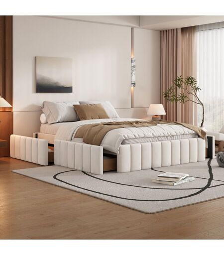 Lit capitonné 140 x 200 cm cadre de lit lit simple lit double lit design avec sommier à lattes (sans matelas) Ce lit plat de style minimaliste moderne est fabriqué à partir d'une sélection de matériaux en velours et MDF de haute qualité pour garantir durabilité et confort ainsi qu'une sensation agréable. de qualité. Le look est simple mais élégant et s'adapte à une variété de styles modernes. Quatre tiroirs facilitent l'organisation et le rangement de vos affaires et les gardent bien rangés. Ce lit crée une atmosphère chaleureuse et confortable à la maison et fait de chaque repos un plaisir. Description + Dimensions Matériau du lit : Velours Dimensions : 140 x 200 cm Couleur : beige Nombre de colis : 2 Assemblage nécessaire : Oui Origine : Vietnam Dimension produit : 218 x 149 x 35 cm Dimensions du colis : Veuillez noter le cahier des charges Dimensions intérieures du lit : 140 x 200 cm Hauteur totale : 35 cm Capacité de poids : 182 kg Nombre de lattes : 10 pièces Épaisseur du matelas ...