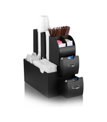 Grâce au module de rangement compact et très pratique Take A Break de CEP pour accessoires et condiments pour café- vous pouvez organiser en toute simplicité les objets indispensables à la préparation du café dans un seul et même endroit. Le module de rangement Take A Break de CEP pour accessoires et condiments pour café vous permet de ranger tout ce dont vous avez besoin pour préparer vos boissons chaudes. Issu de la gamme moderne et élégante Take A Break de CEP pour les salles de pause- de réunion et de réception- ce module de rangement tout-en-un compact et très pratique est équipé de 2 tiroirs et 7 compartiments qui vous permettent de ranger proprement les dosettes- tasses- sucres- crèmes- touillettes- cuillères et serviettes. Prêt à l'emploi- ce module est doté de patins anti-dérapants qui lui confèrent une excellente stabilité. Fabriqué à partir de polystyrène recyclable et résistant aux chocs- ce module de rangement durable et solide destiné aux accessoires pour café est néanmoins pourvu d'un design élégant rehaussé par des poignées chromées fixées aux tiroirs. Pour un rendu uniforme et attrayant- il peut être agréablement combiné à tous les accessoires de la gamme Take A Break de CEP- élégante et moderne. Module de rangement tout-en-un compact pour les accessoires et condiments pour café Ce module de rangement fait partie de la gamme moderne et élégante Take A Break de CEP pour les salles de pause et de réception 2 tiroirs et 7 compartiments avec une excellente capacité de stockage Permet de ranger des dosettes- tasses- sucres- crèmes- touillettes- cuillères et serviettes Prêt à l'emploi Patins anti-dérapants à la base du module pour une stabilité optimale Poignées chromées et design élégant Fabriqué à partir de polystyrène antichoc et recyclable Fabrication française Dimensions : 137 x 320 x 280 mm Couleur : Noir ...
