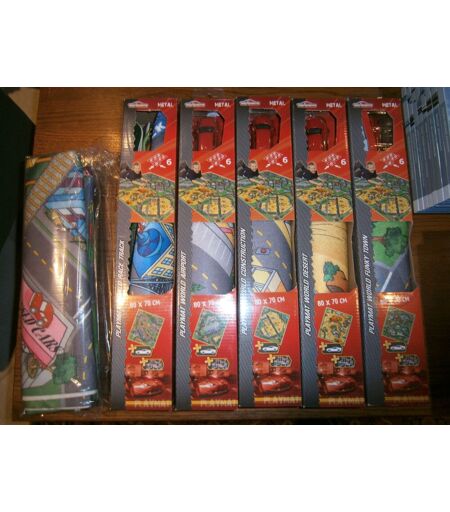 6 tapis dimension 80 cm x 70 cm, qui s'assemblent pour former un grand ensemble cohérent (les 6 tapis sont par exemple : la piste de course, l'aéroport, la ville,le chantier, le désert). Avec les 6 lots : 4 voitures plastique et 4 lots de panneaux de signalisation ...