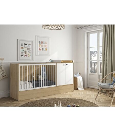 Description générale L'ensemble Trio Lit 60x120 + Commode 2 portes + Armoire 2 portes de la collection Arthur de la marque GALIPETTE crée un véritable cocon pour votre bébé. Avec son design en chêne blond et blanc, il apporte une ambiance douce et moderne à la chambre de votre enfant. Spécifications techniques Dimensions du lit : 60x120 cm Sommier réglable sur deux hauteurs Commode avec niche, deux portes et tablette intérieure Armoire avec deux tablettes intérieures et tube penderie Poignées rondes blanches cerclées de noir Compatibilité et accessoires Option plan à langer pour la commode (non inclus) Installation Facile à assembler avec des instructions claires fournies. Utilisation Idéal pour les nouveau-nés et les jeunes enfants, cet ensemble offre une solution pratique et esthétique pour le rangement et le couchage. ...