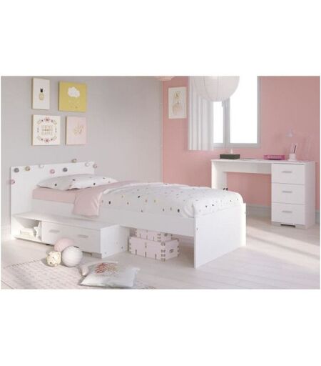 COSMOS Ensemble lit + bureau - Coloris : Blanc - Lit avec 1 tiroir - Montage du tiroir réversible droite ou gauche du lit - Couchage 90x200 cm ajustable en 90x190 cm grace a une cale fournie - Livré sans sommier ni matelas - 1 bureau 3 tiroirs - Panneau de particules revetus de papier décor blanc - Dimensions LxHxP : Lit : 120x74x203 cm - Bureau : 120x75x50 cm ...