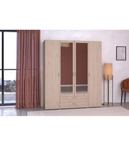 Armoire Varia élégante et fonctionnelle avec 4 portes et 2 tiroirs, finition chêne et blanc. Offre de nombreux rangements avec penderies et étagères. Fabriquée en panneaux de particules, facile à monter soi-même. Dimensions : 185x160x51 cm. Parfaite pour organiser votre chambre avec style. ...