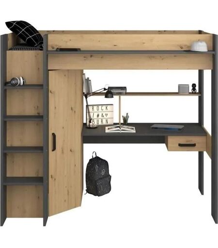 HIGH Lit combiné mezzanine enfant comprenant 1 armoire avec 2 étageres et 1 penderie, 1 bureau avec un tiroir - Structure en panneau de particules revetus de papier décor Chene Artisan et gris ombre - Couchage : 90 x 200 cm - Sommier en panneau inclus - Livré sans matelas - Montage non réversible - Dimensions totales : L204.4 x H178.3 x 116.4 cm - Ne convient pas aux enfants de moins de 6 ans ...