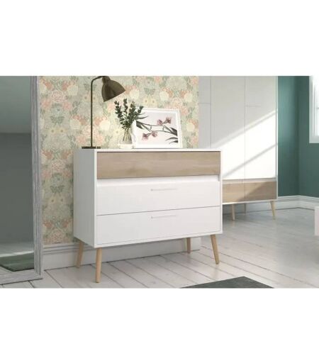 La commode AALBORG de PARISOT allie style scandinave et fonctionnalité. Avec ses trois tiroirs spacieux, elle offre un rangement optimal. Fabriquée en panneaux de particules, elle présente une finition blanche élégante et des pieds en bois vernis. Dimensions : 90,8 x 40 x 77,5 cm. ...