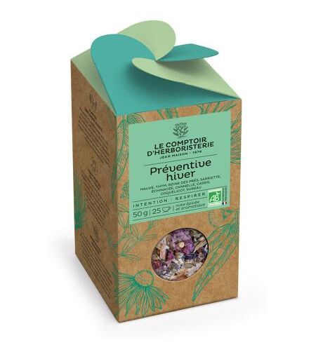LE COMPTOIR D'HERBORISTERIE TISANE PREVENTIVE HIVER BIO 50G Mauve, Thym, Reine des prés, Sarriette, Echinacea, Cannelle, Cassis, Coquelicot, Sureau.