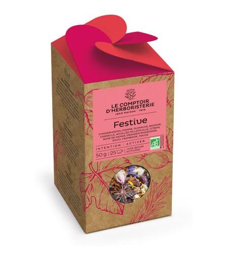LE COMPTOIR D'HERBORISTERIE TISANE FESTIVE BIO 50G Cynorrhodon, Pomme, Guimauve, Badiane, Cannelle, A.Millefeuille, Citron, Rose de Damas, Oranger, Soucis, Framboise, Mauve.
