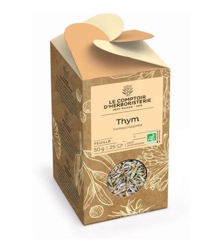 THYM BIO FEUILLE 50G Thymus vulgaris Nom latin : Thymus vulgaris ; Famille des Lamiaceae Boisson savoureuse et stimulante. Elle réconforte et dispose de qualités naturelles propres à renforcer vos défenses naturelles. Sous-arbrisseau... ...