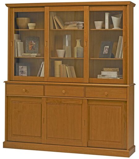 Meuble Buffet - Vaisselier / Bibliothèque Pin Massif Miel 6 Portes Coulissantes 3 Tiroirs, de Style Anglais Largeur 178.6 cm Hauteur 199 cm Profondeur 42.3 cm. Descriptif : - Les tiroirs sont livrés avec deux sortes de poignées (poignées coquille métal et boutons bois) à équiper selon votre préférence. - 3 portes hautes vitrées coulissantes - 3 portes basses pleines coulissantes - 6 Etagères Dimensions intérieures : - Partie haute gauche: Larg. 111.5 cm Haut. 102.5 cm Prof. 28.5 cm (2 tablettes réglables en hauteur Prof. 26.8 cm) - Partie haute droite : Larg. 55.8 cm Haut. 102.5 cm Prof. 28.5 cm (2 tablettes réglables en Prof 26.8 cm) - Partie basse gauche : Larg. 113.5 cm Haut. 62.8 cm Prof. 34 cm (1 tablette réglable en hauteur Prof. 33.5 cm) - Partie basse droite : Larg. 53.8 cm Haut. 62.8 cm Prof. 34 cm (1 tablette réglable en hauteur Prof. 33.5 cm) - 3 Tiroirs : Larg. 50.3 cm Haut. 7.5 / 10 cm Prof. 33.5 cm Caractéristiques techniques : Structure en Pin Massif panneauté, replaqué ...