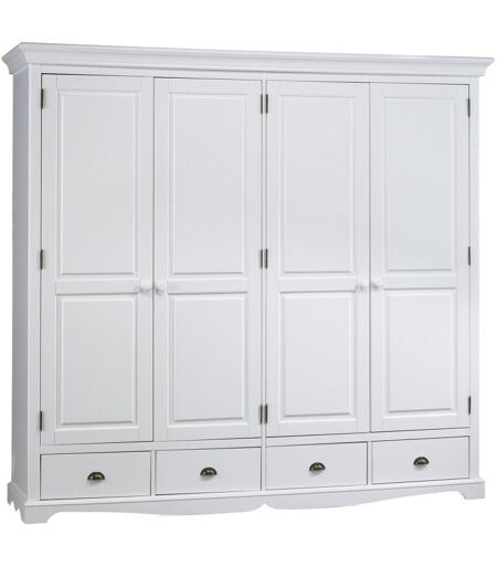 Armoire Penderie Blanche 4 Portes 4 Tiroirs de Style Anglais. Largeur 212 cm Hauteur 195 cm Profondeur 54 cm. Descriptif : - Moitié penderie (1 tringle + 1 étagère fixe) - Moitié lingère (3 étagères réglables en hauteur) - 4 tiroirs coulissant sur glissières métalliques à galets. Les tiroirs sont livrés avec deux sortes de poignées (à équiper selon vos préférences) : - poignées coquille métal - boutons bois blancs (voir photo) Pied de renfort sous l'armoire. Caractéristiques techniques : - Corniche, socle et montants en pin massif. - Structure MDF (panneaux de fibres de bois de moyenne densité) teinté blanc, protection vernis nitrocellulosique. - Meuble livré démonté (montage facile : A faire par 2 personnes) - Pour faciliter le montage, les socles, les charnières et les coulisses métalliques à galets des tiroirs sont livrés pré-montés. - Garantie 2 ans. - Bois issus de forêts gérées durablement. Dimensions utiles : - Etagère Penderie : Largeur 98.2 cm Profondeur 42.5 cm - Niche ...