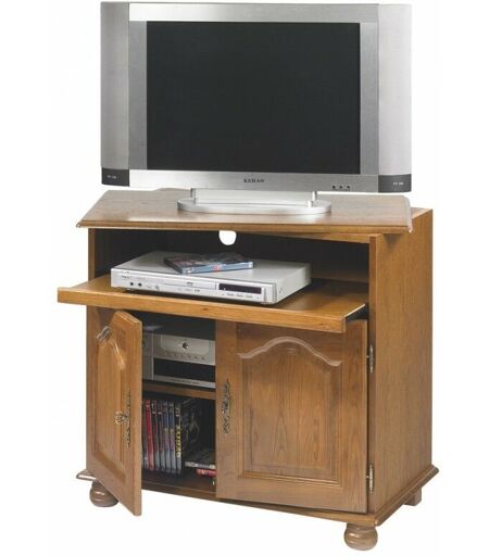 Meuble TV chêne Plateau Pivotant (et coulissant) + Tablette Coulissante. Largeur 82 cm x Hauteur 77 cm x Profondeur 46,5 cm. Descriptif : - Plateau pivotant à 360° et coulissant sur 10 cm (TV) d'avant en arrière - 1 tablette coulissante (lecteur DVD, décodeur) sur glissière métallique à galets. - 1 tablette réglable en hauteur derrière les 2 portes. - 2 Portes en chêne massif - 1 Bandeau de tablette coulissante en chêne massif. - Meuble livré démonté (montage facile, voir la notice de montage) - Quincaillerie des portes en métal doré vieilli - Fausses clés (pas de serrure). - Garantie 2 ans - Fabriqué en France Caractéristiques techniques : - Structure en panneaux de particules de bois plaqués chêne. (extérieurs et intérieurs) - Dessus et dessous alaisés chêne massif. - 2 Pieds boule + 2 pieds carré hêtre massif teintés chêne. - Arrière percé pour le passage des câbles. - Peut supporter un téléviseur de 70 kg. Dimensions utiles : - Niche : Largeur 74.5 cm Hauteur 14.7 cm Profondeur 40 ...
