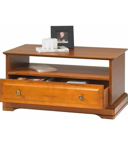 Table basse rectangle plaquée merisier. C'est également un meuble TV. L'esthétique est la même des deux côtés de la table. C'est un grand tiroir qui va d'un côté à l'autre. Avec une façade massive à chaque extrémité. Longueur 82.4 cm Hauteur 41.6 Largeur 46.5 cm. Descriptif : - Le tiroir se positionne aussi bien dans la niche haute que dans la niche basse. - Il s'agit d'un tiroir va-et-vient, il coulisse des deux côtés de la table. Dimensions utiles : Tiroir : Largeur 71.3 cm Hauteur 10.7 cm Profondeur 42.5 cm Niche : Largeur 71,6 cm Hauteur 15 cm Profondeur 42,5 cm Meuble livré démonté (montage facile). Caractéristiques techniques : - Panneaux de particules de bois épaisseur 19 mm plaqués merisier (extérieurs) et plaqués bois d'aniégré (intérieurs) le tout étant teinté merisier puis vernis. - Façades de tiroirs et socles en aulne massif teintés merisier. - Quincaillerie des tiroirs en métal doré vieilli - Meuble livré démonté (montage facile). - Garantie 2 ans - Fabriqué en France ...