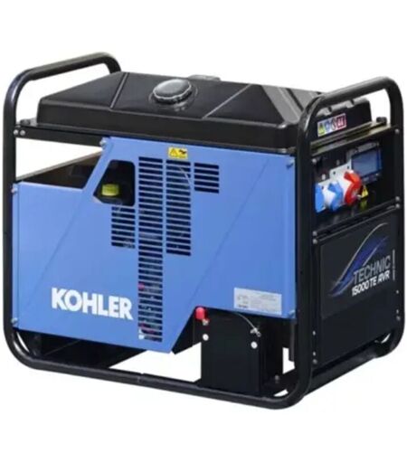 Groupe électrogène triphasé SDMO. Groupe équipé d'un moteur essence KOHLER. Ce groupe électrogène développe une puissance max de 14,4 kVA (11,5 kW). Groupe complet garantie 3 ans. Caractéristiques générales : Gamme : TECHNIC Fréquence : 50 Hz Puissance max : 11,50 kW Puissance max : 14,40 kVA Tension nominale : 400V Nombre de Phase : Triphasé Carburant : Essence Réservoir : 33 Litres Conso. 75% : 5 L/h Autonomie 75% : 6,60 Heure Niveau de puissance acoustique garanti LwA : 97 dB(A) Niveau de pression acoustique @1m : 83 dB(A) Niveau de pression acoustique @7m : 69 dB(A) Caractéristiques moteur : Marque moteur : KOHLER Réf. moteur : CH680 Distribution : O.H.V. Démarrage : Electrique Sécurité huile : Oui Cylindrée : 674 cm3 Capacité huile : 1,90 Litres Caractéristiques alternateur : Technologie : Bagues et balais Régulation AVR : Non Indice de protection : IP 23 Classe d'isolement : H Descriptif prises et coffrets : 1 prise 230V 10/16A - disjoncteur + 1 prise 230V 16A - disjoncteur + 1 ...