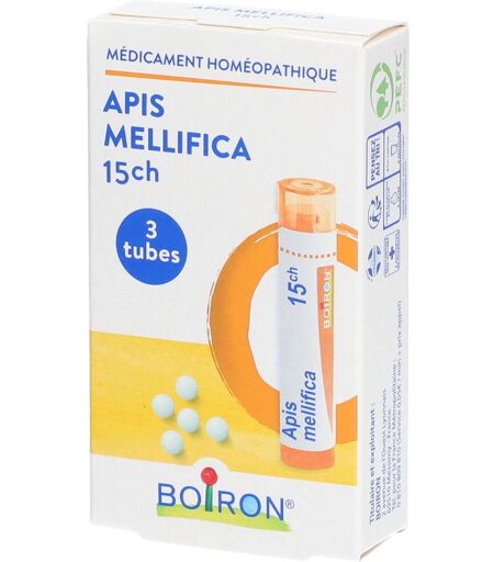 Médicament homéopathique sous forme de granules. Boîte de 3 tubes-dose de 4 g contenant Apis mellifica en dilution 15CH.BénéficesMédicament homéopathique sans indication thérapeutiqueApis mellifica 15CHContient 3 tubes-dose de 4 gFacile à administrer : voie oraleLaboratoire Boiron – fabriqué en FranceIndicationEnregistrement sans indication thérapeutique. Un avis médical est recommandé si les symptômes persistent.Ingrédients actifsApis mellifica 15CHCompositionApis mellifica, saccharose, lactose.Mode d'emploiAdultes : laisser fondre les granules sous la langue.Enfants < 6 ans : dissoudre dans un peu d’eau.Utilisation selon les recommandations ou prescription.Précautions d'emploiTenir hors de portée des enfants. Contient du saccharose et du lactose. Réf. enregistrement EH00065. ...