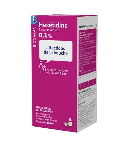 ANTIINFECTIEUX ET ANTISEPTIQUE POUR TRAITEMENT ORAL LOCAL. Ce médicament est indiqué dans le traitement local d'appoint des affections de la bouche. N'utilisez jamais HEXETIDINE BIOGARAN CONSEIL 0,1 % solution pour bain de bouche dans les cas suivants:· Si vous êtes allergique (hypersensible) à l'héxétidine ou à l'un des autres composants contenus dans HEXETIDINE BIOGARAN CONSEIL 0,1 % solution pour bain de bouche.· Chez les enfants de moins de 6 ans.EN CAS DE DOUTE, IL EST INDISPENSABLE DE DEMANDER L'AVIS DE VOTRE MEDECIN OU DE VOTRE PHARMACIEN. MISES EN GARDE SPECIALES :Cette spécialité contient des dérivés terpéniques dans la formule qui peuvent entraîner, à doses excessives, des accidents neurologiques à type de convulsions chez le nourrisson et chez l'enfant. Respectez les posologies et la durée de traitement préconisées.Ce médicament contient un agent colorant azoïque (azorubine E122) et peut provoquer des réactions allergiques.Ce médicament contient de petites quantités d'éthanol (alcool), inférieures à 100 mg par dose.PRECAUTIONS D'EMPLOI :Ne pas dépasser 10 jours de traitement: au-delà consultez votre médecin.EN CAS DE DOUTE NE PAS HESITER A DEMANDER L'AVIS DE VOTRE MEDECIN OU DE VOTRE PHARMACIEN.AFIN D'EVITER D'EVENTUELLES INTERACTIONS ENTRE PLUSIEURS MEDICAMENTS IL FAUT SIGNALER SYSTEMATIQUEMENT TOUT AUTRE TRAITEMENT EN COURS A VOTRE MEDECIN OU A VOTRE PHARMACIEN.NE JAMAIS LAISSER A LA PORTEE DES ENFANTS.En cas d'épilepsie ancienne ou récente, DEMANDER CONSEIL A VOTRE MEDECIN. Si vous prenez ou avez pris récemment un autre médicament, y compris un médicament obtenu sans ordonnance, parlez-en à votre médecin ou à votre pharmacien. En cas d'allaitement, il est préférable de ne pas utiliser ce médicament.D'une façon générale il convient, au cours de la grossesse et de l'allaitement, de toujours demander avis à votre médecin ou à votre pharmacien avant de prendre un médicament. Ce médicament contient un colorant azoïque (azorubine E122), et de l'éthanol. RESERVE A L'ADULTE ET L'ENFANT DE PLUS DE 6 ANS.MODE D'ADMINISTRATION :Utilisation locale en bains de bouche.NE PAS AVALER.FREQUENCE D'ADMINISTRATION :Cette solution pour bain de bouche s'emploie pure ou diluée: 1 dose 2 à 3 fois par jour.Pur: verser HEXETIDINE BIOGARAN CONSEIL dans le gobelet doseur jusqu'à l'encoche indiquant 15 ml.Dilué: en cas d'apparition de manifestations douloureuses. Utiliser la solution diluée au à moitié :Verser HEXETIDINE BIOGARAN CONSEIL dans le gobelet doseur jusqu'à l'encoche indiquant 15 ml. Compléter ensuite avec de l'eau jusqu'à l'encoche indiquant 30 ml.Bien rincer le gobelet doseur après chaque utilisation.DUREE DU TRAITEMENT :La durée d'utilisation est limitée à 10 jours. Si vous avez utilisé plus de HEXETIDINE BIOGARAN CONSEIL 0,1 % solution pour bain de bouche que vous n'auriez dû :Un surdosage n'est pas attendu dans les conditions normales d'utilisation. Certains constituants de ce médicament (huiles essentielles) peuvent entraîner à doses excessives... ...