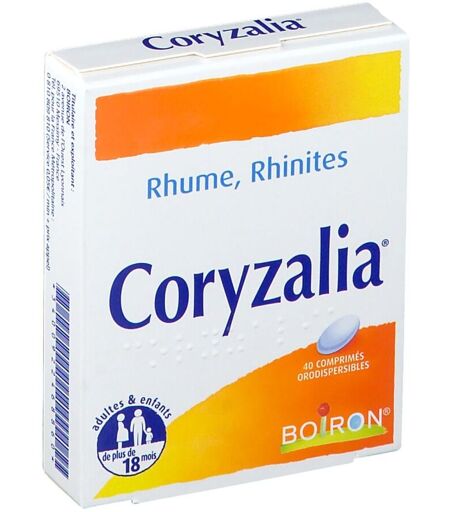 IndicationsCORYZALIA, comprimé orodispersible est un médicament homéopathique traditionnellement utilisé dans le traitement symptomatique du rhume et des rhinites. Voie d'administrationsublingualePosologiePosologieRéservé à l’adulte et à l’enfant de plus de 18 mois.Adultes et enfants à partir de 18 mois : 1 comprimé 6 à 8 fois par jour. L’administration chez l’enfant de 18 mois à 6 ans nécessite de dissoudre le comprimé dans un peu d’eau.Mode et voie d’administrationVoie sublinguale.Fréquence d'administrationEspacer les prises dès amélioration et cesser les prises dès la disparition des symptômes. Durée du traitementLa durée du traitement ne devra pas dépasser une semaine.CompositionDiversContre-indicationsN’utilisez jamais CORYZALIA, comprimé orodispersible :· Chez l’enfant de moins de 18 mois.· Si vous êtes allergique (hypersensible) aux substances actives ou à l’un des composants contenus dans CORYZALIA, comprimé orodispersible.Précautions d'emploiFaites attention avec CORYZALIA, comprimé orodispersible : · L’utilisation de ce médicament est déconseillée chez les patients présentant une intolérance au galactose, un déficit en lactase de Lapp ou un syndrome de malabsorption du glucose ou du galactose (maladies héréditaires rares).PrésentationBoîte de 40 ...
