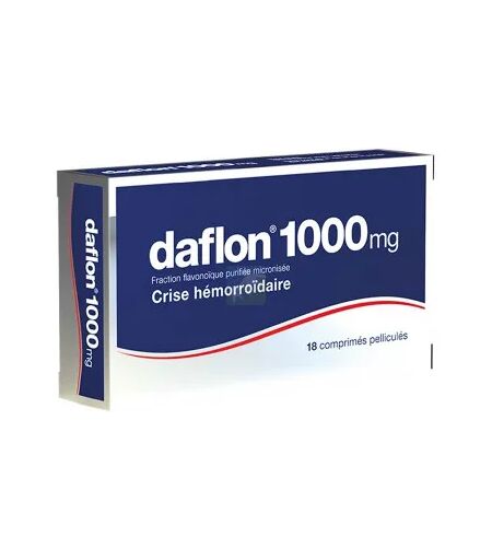 VASCULOPROTECTEURS / MEDICAMENTS AGISSANT SUR LES CAPILLAIRES / BIOFLAVONOIDES – code ATC : C05CA53. Ce médicament est un veinotonique (il augmente le tonus des veines) et un vasculoprotecteur (il augmente la résistance des petits vaisseaux sanguins).Ce médicament est préconisé dans le traitement des signes fonctionnels liés à la crise hémorroïdaire.Si les troubles hémorroïdaires ne cèdent pas en 15 jours, il est indispensable de consulter votre médecin. Adressez-vous à votre médecin ou pharmacien avant de prendre DAFLON 1000 mg, comprimé pelliculé. IL FAUT SIGNALER SYSTEMATIQUEMENT TOUT AUTRE TRAITEMENT EN COURS À VOTRE MEDECIN OU À VOTRE PHARMACIEN. GrossesseSi vous êtes enceinte, si vous pensez être enceinte ou planifiez une grossesse, demandez conseil à votre médecin ou pharmacien avant de prendre ce médicament.AllaitementEn l’absence de données sur le passage du médicament dans le lait maternel, l’allaitement est déconseillé pendant la durée du traitement.Demandez conseil à votre médecin ou à votre pharmacien avant de prendre ce médicament. Veillez à toujours prendre ce médicament en suivant exactement les indications de votre médecin ou pharmacien. Vérifiez auprès de votre médecin ou pharmacien en cas de doute.La dose recommandée est de 3 comprimés par jour pendant 4 jours, puis 2 comprimés par jour pendant les 3 jours suivants au moment des repas. Comme tous les médicaments, ce médicament peut provoquer des effets indésirables, mais ils ne surviennent pas systématiquement chez tout le monde.La fréquence des effets indésirables possibles listés ci-dessous est définie en utilisant le système suivant :· très fréquent (affecte plus de 1 utilisateur sur 10) · fréquent (affecte 1 à 10 utilisateurs sur 100) · peu fréquent (affecte 1 à 10 utilisateurs sur 1 000) · rare (affecte 1 à 10 utilisateurs sur 10 000) · très rare (affecte moins de 1 utilisateur sur 10 000) · fréquence inconnue (les données disponibles ne permettent pas d’estimer la fréquence) Ils peuvent inclure :Fréquent : diarrhée, indigestion, nausée, vomissement.Peu fréquent : colite.Rare : sensations vertigineuses, maux de tête, malaise, rash, prurit, urticaire.Fréquence inconnue : douleur abdominale, œdème isolé du visage, des paupières, des lèvres. Exceptionnellement : œdème de Quincke. NE PAS DEPASSER LA DATE LIMITE D'UTILISATION FIGURANT SUR LE CONDITIONNEMENT EXTERIEUR. Fraction flavonoïque purifiée micronisée ………………………………………………………1000,000 mgCorrespondant à :.. Diosmine 90 pour cent……………………………………………………………………………….900,000 mg... Flavonoïdes exprimés en hespéridine 10 pour cent………………………………………………100,000 mgHumidité moyenne………………………………………………………………………................40,000 mgPour un comprimé pelliculé. Carboxyméthylamidon sodique, cellulose microcristalline, gélatine, stéarate de magnésium, talc.Pelliculage : dioxyde de titane (E 171), glycérol, laurylsulfate de sodium, macrogol 6000, hypromellose, oxyde de fer jaune (E 172), oxyde de fer rouge (E 172), stéarate de magnésium. ...