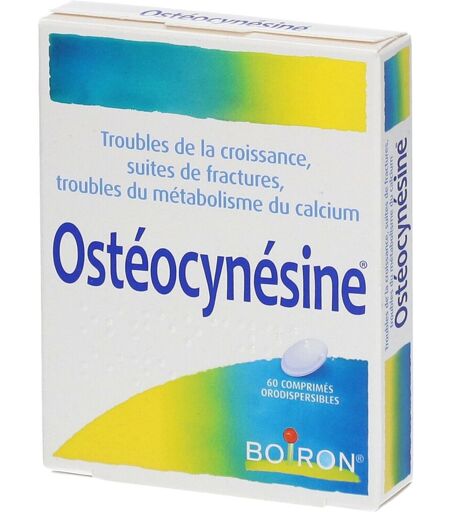 OSTÉOCYNÉSINE®, comprimé orodispersible est un médicament homéopathique traditionnellement utilisé dans les troubles de la croissance, les suites de fractures, les troubles du métabolisme du calcium. Produit homéopathique, donc sans indication thérapeutique. Conseils d'utilisation: 2 comprimés par jour. Chez l’adulte et l’enfant de plus de 6 ans, laisser fondre les comprimés sous la langue. Chez l’enfant de moins de 6 ans, dissoudre les comprimés dans un peu d’eau en raison du risque de fausse route. Durée maximale du traitement : 1 mois. Le traitement pourra être renouvelé sur avis médical. Mode d’administration Voie sublinguale. Composition: Ce que contient OSTÉOCYNÉSINE®, comprimé orodispersible Les substances actives sont : Calcarea carbonica ostrearum 3 DH......0,625 mg Calcarea fluorica 3 DH...........................0,625 mg Calcarea phosphorica 3 DH...................0,625 mg Sulfur iodatum 4 CH...............................0,625 mg Les autres composants sont : Lactose, croscarmellose sodique, stéarate de magnésium. Contre-indications: Ne prenez jamais OSTÉOCYNÉSINE®, comprimé orodispersible Si vous êtes allergique aux substances actives ou à l’un des autres composants contenus dans ce médicament, mentionnés dans la rubrique 6. Présentation Boîte de 3 plaquettes thermoformées de 20 comprimés orodispersibles ...
