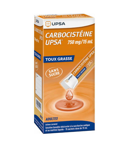 Classe pharmacothérapeutique : MUCOLYTIQUE - code ATC : R05CB03 (R : Système Respiratoire). Ce médicament fluidifie les sécrétions (mucosités) présentes dans les bronches. Il facilite leur évacuation par la toux (expectoration). Ce médicament est réservé à l'adulte. Il est utilisé en cas de toux grasse récente avec difficulté à expectorer. Vous devez vous adresser à votre médecin si vous ne ressentez aucune amélioration ou si vous vous sentez moins bien après 5 jours. N’utilisez jamais CARBOCISTEINE UPSA 750 mg/15 mL ADULTES SANS SUCRE, solution buvable en sachet édulcorée à la saccharine sodique et au maltitol liquide · si vous êtes allergique à la carbocistéine ou à l’un des autres composants contenus dans ce médicament, mentionnés dans la rubrique 6. · chez l’enfant. Avertissements Vous ne devez pas utiliser de médicaments qui empêchent la toux (antitussifs) ou qui assèchent les secrétions bronchiques quand vous prenez CARBOCISTEINE UPSA. En effet, CARBOCISTEINE UPSA fluidifie les sécrétions, ce qui facilite leur évacuation par la toux. La toux est utile pour expectorer. Adressez-vous à votre médecin ou pharmacien avant de prendre CARBOCISTEINE UPSA 750 mg/15 mL ADULTES SANS SUCRE, solution buvable en sachet édulcorée à la saccharine sodique et au maltitol liquide. · Si vous avez de la fièvre ou si votre expectoration est « verdâtre ». · Si vous souffrez d’une maladie chronique des bronches ou des poumons. · Si vous avez un ulcère digestif (de l’estomac ou de l’intestin). · Chez les sujets âgés. · En cas d’administration concomitante avec des médicaments susceptibles de provoquer des saignements de l’estomac ou de l’intestin. En cas d’apparition de saignement de l’estomac ou de l’intestin, il est recommandé d’arrêter le traitement. Précautions d’emploi Ce médicament doit être utilisé avec prudence en cas d’ulcère de l’estomac ou du duodénum. La quantité d’alcool dans ce médicament peut modifier les effets d’autres médicaments. CARBOCISTEINE UPSA 750 mg/15 mL ADULTES SANS SUCRE, solution buvable en sachet édulcorée à la saccharine sodique et au maltitol liquide contient du sodium, du maltitol liquide et de l’éthanol à 96 pour cent. Ce médicament contient 99,9 mg de sodium par sachet de 15 mL. A prendre en compte chez les patients suivant un régime hyposodé strict. L’utilisation de ce médicament est déconseillée chez les patients présentant une intolérance au fructose (maladie héréditaire rare). Ce médicament peut provoquer un effet laxatif modéré. Ce médicament contient 11,9 % de vol d’éthanol (alcool) c’est-à-dire jusqu’à 1,5 g, par dose, de 15 mL de solution buvable, ce qui équivaut à 35,6 mL de bière, 14,8 mL de vin par dose. L’utilisation de ce médicament est dangereuse chez les sujets alcooliques et doit être prise en compte chez les femmes enceintes ou allaitant, les enfants et les groupes à haut risque tels que les insuffisants hépatiques ou les épileptiques. Informez votre médecin ou pharmacien si vous prenez, avez récemment pris ou... ...
