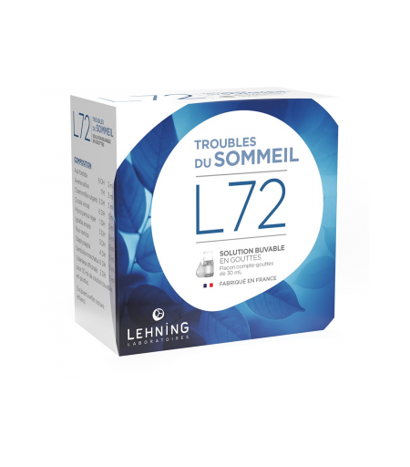 Médicament homéopathique traditionnellement utilisé dans les troubles mineurs du sommeil et les troubles liés à l'anxiété et à l'hyperexcitabilité (émotivité, nervosité...). Veuillez lire attentivement cette notice avant d'utiliser ce médicament. Elle convient des informations importantes pour votre traitement.Si vous avez d'autres questions, si vous avez un doute, demandez plus d'informations à votre médecin ou à votre pharmacien- Si vous avez besoin de plus d'informations et de conseils, adressez-vous à votre pharmacien.- Si les symptômes s'aggravent ou persistent, consultez un médecin.- Si vous remarquez des effets indésirables, ou inhabituels, veillez en informer votre médecin ou votre pharmacien. N'utilisez jamais L72, solution buvable en gouttes :Si vous êtes allergiques (hypersensible) aux substances dans L72, solution buvable en gouttes Faites attention avec L72, solution buvable en gouttesCe médicament contient au maximum 43% V-V d'éthanol (alcool). 30 gouttes contiennent 256 mg d'éthanol ce qui équivaut à 6,46 ml de bière (env., 0,65 cl) ou 2,69 ml de vin (env. 0,27 cl).En raison de la présence d'éthanol, ce médicament est dangereux pour les personnes souffrant d'alcoolisme. La présence d'éthanol, doit également être prise en compte chez les femmes enceintes ou allaitantes, les enfants et les personnes à risques, par exemple chez les personnes souffrant d'une malade du foie ou d'épilepsie. Si vous prenez ou avez pris récemment un autre médicament. Y compris un médicament obtenu sans ordonnance, parlez-en à votre médecin ou à votre pharmacien. Demander conseil à votre médecin ou à votre pharmacien avant de prendre tout médicament. Contient de l'éthanol. Voie orale.Adultes :Troubles mineurs du sommeil : 30 gouttes avant le dîner et 60 gouttes au coucher.Nervosité : 30 gouttes supplémentaires matin et soir.Enfant à partir de 2 ans : ¼ ou ½ dose selon l'âge. A prendre dans un peu d'eau, de préférence à distance des repas. Si vous avez pris de L72, solution buvable en gouttes que vous n'auriez dû :Consultez votre médecin ou votre pharmacien. Comme tous les médicaments, L72, solution buvable en gouttes est susceptible d'avoir des effets indésirables, bien que tout le monde n'y soit pas sujet. Si vous remarquez des effets indésirables, ou inhabituels, veuillez en informer votre médecin ou votre pharmacien. Tenir hors de la portée et de la vue des enfants. Ne pas dépasser la date limite d'utilisation figurant sur l'étiquette et l'emballage extérieur. Tenir le flacon soigneusement fermé. Conserver à une température inférieure à 25° C. Sumbulus moschatus : 3 DHOleum gaultheriae : 4 DHCicuta virosa : 4 DHAsa foetida : 3 DHCorydalis formosa : 3 DHIgnatia amara : 4 DHValeriana officinalis : 3 DHStaphysagria : 4 DHAvena sativa : T.M.Hyoscyamus niger : 2 DHp.e.q.s.p. 30 ml La préparation homéopathique complexe Lehning N°72 est un médicament homéopathique destiné à résoudre les troubles du sommeil en favorisant l'endormissement. Les problèmes de... ...