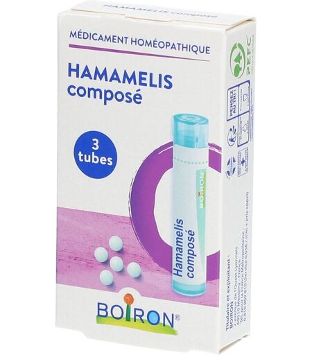 HAMAMELIS composé. EH02168 enregistrement sans indications thérapeutique. Conseil d'utilisation Voie orale. Adulte: laisser fondre les granules sous la langue. Enfant : avant 6 ans, dissoudre les granules dans un peu d'eau. Mise en garde spéciale Contient du saccharose et du lactose. Composition: Hamamelis 3 CH, Pulsatilla 3 CH, Echinacea angustifolia 3 CH, Fluoricum acidum 3 CH, Viburnum prunifolium 3 CH, Tussilago farfara 3 CH, Corylus avellana 6 DH, Aesculus hippocastanum 6 DH. ...