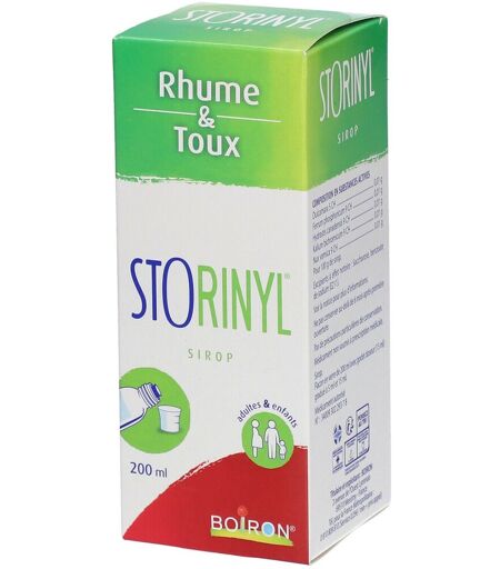 STORINYL®, sirop est médicament homéopathique traditionnellement utilisé dans le traitement symptomatique : du rhume (congestion nasale, écoulement nasal, éternuement, mal de gorge mineur). de la toux sèche et grasse. Produit homéopathique, donc sans indication thérapeutique. Conseils d'utilisation: Posologie Ce médicament ne doit pas être utilisé chez l’enfant de moins de 2 ans sans avis médical. Adultes et enfants de plus de 12 ans : 1 dose de 15 ml à l’aide du godet doseur 3 à 5 fois par jour. Enfants de 2 ans à 12 ans : 1 dose de 5 ml à l’aide du godet doseur 3 fois par jour. Enfants de moins de 2 ans : 1 dose de 5 ml à l’aide du godet doseur à diluer dans une petite quantité de liquide 3 fois par jour. Espacer les prises dès amélioration et cesser les prises dès la disparition des symptômes. Durée de traitement La durée de traitement ne doit pas dépasser une semaine. Mode d’administration Voie orale Composition: Ce que contient STORINYL®, sirop Les substances actives sont : Dulcamara 5 CH...............................0,01 g Ferrum phosphoricum 9 CH............0,01 g Hydrastis canadensis 9 CH.............0,01 g Kalium bichromicum 9 CH..............0,01 g Nux vomica 9 CH.............................0,01 g Pour 100 g de sirop Les autres composants sont : Eau purifiée, saccharose, benzoate de sodium (E211), acide citrique monohydraté (E330). Contre-indications: Ne prenez jamais STORINYL®, sirop: Si vous êtes allergique aux substances actives ou à l’un des autres composants contenus dans ce médicament, mentionnés dans la rubrique 6. Présentation Flacon de 200 ml et un godet doseur (15 ml) gradué à 5 ml et 15 ml ...