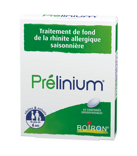 Classe pharmacothérapeutique : Médicament homéopathique PRELINIUM, comprimé orodispersible est un médicament homéopathique traditionnellement utilisé dans le traitement de fond de la rhinite allergique saisonnière. Ne prenez jamais PRELINIUM, comprimé orodispersible : Si vous êtes allergique aux substances actives ou à l’un des autres composants contenus dans ce médicament. L’utilisation de ce médicament est déconseillée chez les patients présentant une intolérance au galactose, un déficit en lactase de Lapp ou un syndrome de malabsorption du glucose ou du galactose (maladies héréditaires rares). Si votre médecin vous a informé(e) d’une intolérance à certains sucres, contactez-le avant de prendre ce médicament. Ce médicament contient moins de 1 mmol (23 mg) de sodium par comprimé, c.-à-d. qu’il est essentiellement « sans sodium ». Compte-tenu des hauteurs de dilution des souches composant PRELINIUM, comprimé orodispersible, ce médicament peut être utilisé pendant la grossesse et l’allaitement. Médicament réservé à l’adulte et à l’enfant de plus de 6 ans Posologie Un comprimé par jour un mois avant la date présumée de l’allergie et durant la saison du ou des pollens responsables. Mode d’administration Voie orale Laissez fondre le comprimé dans la bouche. Durée de traitement La durée de traitement sera fonction de la saison pollinique. Comme tous les médicaments, ce médicament peut provoquer des effets indésirables, mais ils ne surviennent pas systématiquement chez tout le monde. Déclaration des effets secondaires Si vous ressentez un quelconque effet indésirable, parlez-en à votre médecin ou votre pharmacien. Ceci s’applique aussi à tout effet indésirable qui ne serait pas mentionné dans cette notice. Vous pouvez également déclarer les effets indésirables directement via le système national de déclaration : Agence nationale de sécurité du médicament et des produits de santé (ANSM) et réseau des Centres Régionaux de Pharmacovigilance - Site internet: www.signalement-sante.gouv.fr En signalant les effets indésirables, vous contribuez à fournir davantage d’informations sur la sécurité du médicament. Tenir ce médicament hors de la vue et de la portée des enfants. N’utilisez pas ce médicament après la date de péremption indiquée sur la boîte. La date de péremption fait référence au dernier jour du mois. A conserver à une température ne dépassant pas 30°C. Ne jetez aucun médicament au tout-à-l’égout ou avec les ordures ménagères. Demandez à votre pharmacien d’éliminer les médicaments que vous n’utilisez plus. Ces mesures contribueront à protéger l’environnement. Les substances actives sont : Apis mellifica 15 CH..............................0,833 mg Pollens 15 CH...........................................0,833 mg Poumon histamine 15 CH................0,833 mg Pour un comprimé de 250 mg. ...
