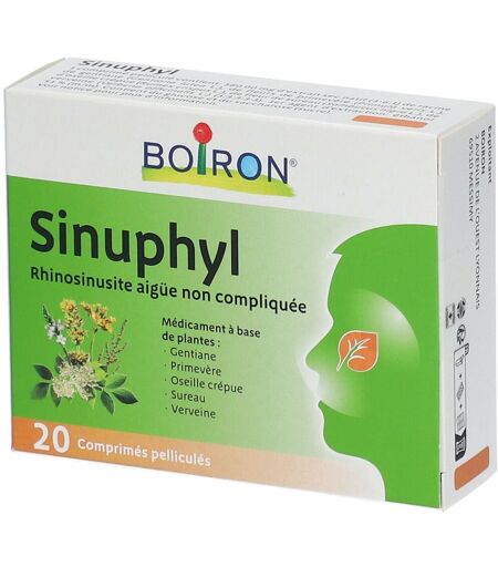 Indications Médicament à base de plantes utilisé pour traiter les inflammations aigües non compliquées des sinus paranasaux chez l'adulte. Voie d'administration orale Posologie La dose recommandée est : Adultes : 1 comprimé pelliculé 3 fois par jour (3 comprimés pelliculés par jour maximum). Mode d’administration Voie orale Réservé aux adultes Sinuphyl® est à avaler 3 fois par jour (matin, midi et soir) avec un peu de liquide (par ex. avec un verre d'eau) sans le croquer. Si vous avez l'estomac sensible, il est préférable de prendre Sinuphyl® après le repas. Durée de traitement Sauf indication contraire, la durée d'utilisation est de 7 à 14 jours. Si aucune amélioration n'est constatée ou si les symptômes persistent au-delà de cette période, veuillez consulter un médecin. Composition Substance active : 1 comprimé pelliculé contient : 160,00 mg d'extrait sec natif (3-6:1) de racine de gentiane (Gentiana lutea L.), de fleurs de primevère (Primula veris L.), d'oseille crépue (Rumex crispus L.), de fleur de sureau (Sambucus nigra L.), de verveine (Verbena officinalis L.) (1:3:3:3:3) 1er agent d'extraction : éthanol 51 % (m/m) Excipients à effet notoire : Sirop de glucose 3,141 mg Saccharose 133,736 mg Contre-indications Ne prenez SINUPHYL® : si vous êtes allergique (hypersensible) à la substance active ou à l'un des autres composants contenus dans ce médicament (mentionnés dans la rubrique 6) ou si vous avez, ou avez eu un ulcère gastroduodénal. Précautions d'emploi Adressez-vous à votre médecin si les symptômes persistent pendant plus de 7 à 14 jours, s'ils s'aggravent ou réapparaissent périodiquement et / ou si vous présentez de la fièvre, des saignements de nez, des douleurs intenses, un écoulement nasal purulent, des troubles de la vision, un engourdissement asymétrique du milieu du visage, des yeux ou du visage. Avec une gastrite connue et chez les patients ayant un estomac sensible, une attention particulière est requise lors de la prise de ce médicament. Il est préférable de prendre Sinuphyl® après les repas avec un verre d'eau. Présentation Boîte de 20 comprimés pelliculés ...