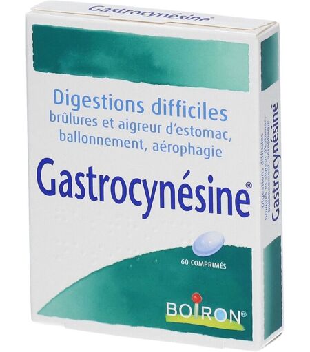IndicationsGASTROCYNESINE, comprimé est un médicament homéopathique traditionnellement utilisé dans le traitement des digestions difficiles (brûlures et aigreur d'estomac, ballonnement, aérophagie).Voie d'administrationoralePosologieMédicament réservé à l'adulte et l'enfant de plus de 6 ans.Chez les enfants entre 6 et 12 ans, ce médicament ne doit pas être administré sans avis médical.2 comprimés à sucer deux à trois fois par jour, de préférence avant les repas.Mode et voie d'administrationVoie orale.Fréquence d'administrationEspacer les prises dès amélioration et cesser les prises dès la disparition des symptômes.Durée du traitementLa durée du traitement ne doit pas dépasser dix jours sans avis médical.CompositionDiversContre-indicationsNe prenez jamais GASTROCYNESINE, comprimé:· Enfants de moins de 6 ans.Précautions d'emploiFaites attention avec GASTROCYNESINE, comprimé:· L'utilisation de ce médicament est déconseillée chez les patients présentant une intolérance au fructose, un syndrome de malabsorption du glucose et du galactose ou un déficit en sucrase/isomaltase (maladies héréditaires rares).· L'utilisation de ce médicament est déconseillée chez les patients présentant une intolérance au galactose, un déficit en lactase de Lapp ou un syndrome de malabsorption du glucose ou du galactose (maladies héréditaires rares).PrésentationBoîte de 60 ...