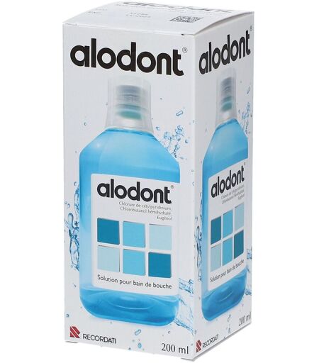 Indications Ce médicament est un bain de bouche.Il est préconisé dans le traitement local d'appoint des infections de la bouche ou en soins après une intervention chirurgicale de la cavité buccale.Voie d'administration buccalePosologiePosologieRESERVE A L'ADULTE ET A L'ENFANT DE PLUS DE 7 ANS.Utilisation locale en bains de bouche.Ne pas avaler.Chez l'adulte: 3 bains de bouche par jour avec du produit pur, garder le produit une minute dans la bouche.Chez l'enfant de 7 à 12 ans: 3 bains de bouche par jour avec du produit dilué à 50 % avec de l'eau.Mode et voie d'administrationUtilisation locale en bains de bouche.Ne pas avaler.Durée du traitementLe traitement ne devra pas dépasser 5 jours sans avis médical.Composition Cétylpyridinium + chlorobutanol + eugénolContre Indications N'utilisez jamais ALODONT, solution pour bain de bouche dans le cas suivant:· allergie connue à l'un des constituants.EN CAS DE DOUTE, IL EST INDISPENSABLE DE DEMANDER L'AVIS DE VOTRE MEDECIN OU DE VOTRE PHARMACIEN.Precautions d'emploi Faites attention avec ALODONT, solution pour bain de bouche:Mises en garde spécialesL'usage prolongé (plus de 5 jours) de ce médicament n'est pas souhaitable car il peut modifier l'équilibre microbien naturel de la bouche, de la gorge.Cette spécialité contient des dérivés terpéniques qui peuvent entraîner à doses excessives des accidents neurologiques à type de convulsions chez le nourrisson et chez l'enfant. Respecter les posologies et la durée de traitement préconisées (voir rubrique posologie).Précautions d'emploiEn cas d'aggravation des symptômes ou d'absence d'amélioration au bout de 5 jours: CONSULTEZ VOTRE MEDECIN.En cas d'épilepsie ancienne ou récente, DEMANDER CONSEIL A VOTRE MEDECIN.Ce médicament contient de l'huile de ricin et peut provoquer des réactions cutanées (par exemple: eczéma).EN CAS DE DOUTE NE PAS HESITER A DEMANDER L'AVIS DE VOTRE MEDECIN OU DE VOTRE PHARMACIEN.Présentation Flacon (+ godet-doseur) de 200 ml ...