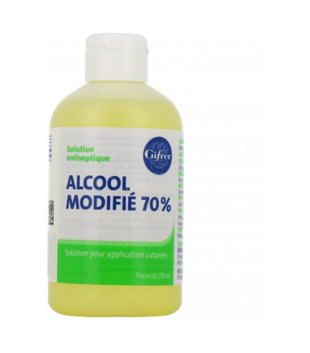 AUTRES ANTISEPTIQUES ET DESINFECTANTS.Ce médicament est un antiseptique. · Antisepsie des petites plaies superficielles et peu étendues.· Préparation de la peau avant injection ou ponction. N'utilisez jamais ALCOOL MODIFIE GIFRER, solution pour application cutanée dans les cas suivants :· Si vous êtes allergiques (hypersensible) à l'alcool ou à l'un des autres composants contenus dans, ALCOOL MODIFIE GIFRER, solution pour application cutanée notamment à la tartrazine (ou sensibilisation de groupe).· Ne pas utiliser chez le nourrisson en dessous de 30 mois (présence de camphre). Faites attention avec ALCOOL MODIFIE GIFRER, solution pour application cutanée :Mises en garde spéciales· Usage externe. Ne pas avaler.· L'alcool ne doit pas être utilisé pour la pratique des alcoolémies.Précautions d'emploi· Ne pas appliquer sur les muqueuses (alcool à 70°).· Ne pas utiliser sous pansement occlusif (majoration du risque de sensibilisation).· L'alcool peut être irritant sur les tissus lésés. Compte tenu des interférences possibles (antagonisme, inactivation…), l'emploi simultané ou successif d'antiseptiques est à éviter. Si vous prenez ou avez pris récemment un autre médicament, y compris un médicament obtenu sans ordonnance, parlez-en à votre médecin ou votre pharmacien.Utilisation pendant la grossesse et l'allaitementCe médicament doit être utilisé avec prudence pendant la grossesse et l'allaitement. Ne pas appliquer sur les seins durant l'allaitement.Demandez conseil à votre médecin ou à votre pharmacien avant d’utiliser tout médicament.Posologie, Mode et/ou voie(s) d'administration, Fréquence d'administration et Durée du traitementPosologieAppliquer sur la surface à traiter au moyen d'une compresse.Jeter la compresse après usage.Mode et voie d'administrationVoie cutanée.Description des effets indésirables éventuelsComme tous les médicaments, ALCOOL MODIFIE GIFRER, solution pour application cutanée est susceptible d'avoir des effets indésirables, bien que tout le monde n'y soit pas sujet : notamment, risque d'allergie à l'un des constituants (tartrazine).NE PAS HESITER A DEMANDER L'AVIS DE VOTRE MEDECIN OU DE VOTRE PHARMACIEN.Si vous remarquez des effets indésirables non mentionnés dans cette notice, ou si certains effets indésirables deviennent graves, veuillez en informer votre médecin ou votre pharmacien.Conditions de conservationTenir ce médicament hors de la vue et de la portée des enfants.N’utilisez pas ce médicament après la date de péremption indiquée sur le conditionnement extérieur après EXP. La date de péremption fait référence au dernier jour de ce mois.Substances activesEthanol à 96 pour cent................................................................................................................................... 73,7 mlPour 100 ml de solution.Autres composantsCamphre synthétique, tartrazine (E 102), eau purifiée. ...