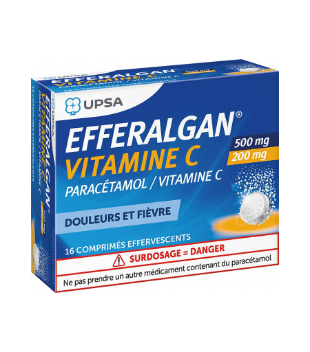 Ce médicament est un antalgique (calme la douleur) et un antipyrétique (fait baisser la fièvre).Ce médicament contient du paracétamol.Il est indiqué en cas de douleur et/ou fièvre telles que maux de tête, états grippaux, douleurs dentaires, courbatures, règles douloureuses. Cette présentation est réservée à l'adulte et à l'enfant à partir de 27 kg (soit environ 8 ans)Pour les enfants ayant un poids inférieur à 27 kg, il existe d'autres présentations de paracétamol : demandez conseil à votre médecin ou à votre pharmacien.Si votre médecin vous à informé(e) d'une intolérance à certains sucres, contactez-le avant de prendre ce médicament. EFFERALGAN VITAMINEC 500 mg-200 mg, comprimé effervescent NE DOIT PAS ETRE UTILISE dans les cas suivants :- Allergie connue au paracétamol ou aux autres constituants,- Maladie grave du foie,- En cas de calculs rénaux, lors de l'utilisation de fortes doses de vitamine C (supérieures à 1 g).En cas de doute, ne pas hésiter à demander ' l'avis de votre médecin ou de votre pharmacien MISES EN GARDEEn cas de surdosage ou de prise par erreur d'une dose trop élevée, consultez immédiatement votre médecin.Ce médicament contient du paracétamol et de la vitamine C. D'autres médicaments en contiennent. Ne les associez pas, afin de ne pas dépasser la dose quotidienne recommandée (cf. Comment prendre EFFERALGAN VITAMINE C 500 mg-200 mg, comprimé effervescent).PRECAUTIONS PARTICULIERESSi la douleur persiste plus de 5 jours ou la fièvre plus de 3 jours, ou en cas d'efficacité insuffisante ou de survenue de tout autre signe, ne pas continuer le traitement sans l'avis de votre médecin.Avant de débuter un traitement par ce médicament,Vérifier que vous ne prenez pas d'autres médicaments contenant du paracétamol.Prévenez votre médecin en cas de maladie du foie ou des reins, ou d'abus d'alcool.Prévenez votre médecin si vous prenez d'autres médicaments contenant du paracétamol.En cas de problèmes de nutrition (malnutrition) 555 ou de déshydratation, EFFERALGAN VITAMINE C = 500 mg-200 mg, comprimé effervescent doit être utilisé avec précaution.L'utilisation de ce médicament est déconseillée chez les patients présentant une intolérance au fructose (maladie héréditaire rare).Ce médicament contient du sodium, ce médicament contient 388 mg de sodium par comprimé. A prendre en compte chez les patients contrôlant leur apport alimentaire en sodium.En cas de doute, ne pas hésiter à demander l'avis de votre médecin ou de votre pharmacien. Signalez que vous ou votre enfant prenez ce médicament si votre médecin vous prescrit, à vous ou à lui, un dosage du taux d'acide urique dans le sang.Afin d'éviter d'éventuelles interactions entre plusieurs médicaments il faut signaler systématiquement tout autre traitement en cours à votre médecin ou à votre pharmacien Le paracétamol, dans les conditions normales d'utilisation, peut être utilisé pendant la grossesse ainsi qu'en cas d'allaitement.D'une façon générale, il convient au cours de la grossesse et de... ...