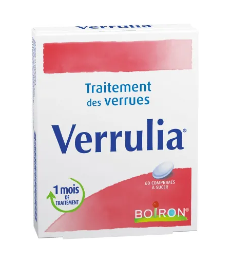 VERRULIA, comprimé à sucer est un médicament homéopathique traditionnellement utilisé dans le traitement des verrues. N'utilisez jamais VERRULIA, comprimé à sucer:Chez l'enfant de moins de 6 ans en raison du risque de fausse route lié à la forme pharmaceutique. Faites attention avec VERRULIA, comprimé à sucer:· En raison de la présence de lactose, ce médicament ne doit pas être utilisé en cas de galactosémie congénitale, de syndrome de malabsorption du glucose et du galactose ou d'un déficit en lactase.· En raison de la présence de saccharose, ce médicament ne doit pas être utilisé en cas d'intolérance au fructose, de syndrome de malabsorption du glucose et du galactose ou de déficit en sucrase-isomaltase (maladies métaboliques rares). Si vous prenez ou avez pris récemment un autre médicament, y compris un médicament obtenu sans ordonnance, parlez-en à votre médecin ou à votre pharmacien Ce médicament est à prendre en dehors des repas. Demandez conseil à votre médecin ou à votre pharmacien avant de prendre tout médicament. Saccharose, lactose PosologieMédicament réservé à l'adulte et à l'enfant de plus de 6 ans.1 comprimé à sucer, matin et soir pendant 1 mois.Si les symptômes persistent après un mois de traitement, un avis médical est nécessaire.En cas d'aggravation, consulter votre médecin.Mode d'administrationVoie orale.Comprimé à sucer. Si vous avez pris plus de VERRULIA, comprimé à sucer que vous n'auriez dû:Consultez immédiatement votre médecin ou votre pharmacien Si vous oubliez de prendre VERRULIA, comprimé à sucer:Ne prenez pas de dose double pour compenser la dose que vous avez oublié de prendre. Comme tous les médicaments, VERRULIA, comprimé à sucer est susceptible d'avoir des effets indésirables, bien que tout le monde n'y soit pas sujet.Si vous remarquez des effets indésirables non mentionnés dans cette notice, ou si certains effets indésirables deviennent graves, veuillez en informer votre médecin ou votre pharmacien. Pas de précautions particulières de conservation. Antimonium crudum 9 CH ................................................ 1 mgNitricum acidum 9 CH ..................................................... 1 mgThuya occidentalis 9 CH .................................................. 1 mgPour un comprimé. Saccharose, lactose, stéarate de magnésium. ...