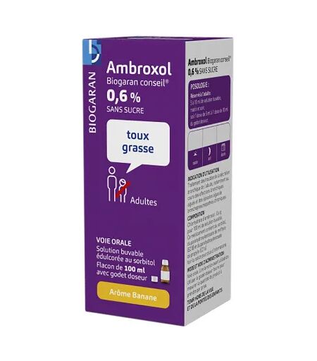 Ce médicament est un expectorant. Il facilite l'évacuation par la toux des sécrétions bronchiques. Il est indiqué dans le traitement des troubles de la sécrétion bronchique de l'adulte, notamment au cours des affections bronchiques aiguës et des épisodes aigus des bronchopneumopathies chroniques. Si votre médecin vous a informé(e) d'une intolérance à certains sucres, contactez-le avant de prendre ce médicament. Ne prenez jamais AMBROXOL BIOGARAN CONSEIL 0,6 % SANS SUCRE, solution buvable édulcorée au sorbitol:si vous êtes allergique (hypersensible) à la substance active (l'Ambroxol) ou à l'un des composants de ce médicament. Vous trouverez la liste des composants à la rubrique 6.EN CAS DE DOUTE, IL EST INDISPENSABLE DE DEMANDER L'AVIS DE VOTRE MEDECIN OU DE VOTRE PHARMACIEN Faites attention avec AMBROXOL BIOGARAN CONSEIL 0,6 % SANS SUCRE, solution buvable édulcorée au sorbitol:Il est conseillé de ne pas prendre de médicament antitussif ou de médicament asséchant les sécrétions bronchiques durant la période de traitement par ce médicament.Respectez les posologies et la durée de traitement préconisées.L'utilisation de ce médicament est déconseillée chez les patients présentant une intolérance au fructose (maladie héréditaire rare). En raison de la présence de sorbitol, ce médicament peut provoquer des troubles digestifs légers (diarrhées).Valeur calorique 2,6 kcal par g de sorbitol.Ce médicament contient du parahydroxybenzoate de méthyle (E218) et du parahydroxybenzoate de propyle (E216) et peut provoquer des réactions allergiques (éventuellement retardées).EN CAS DE DOUTE NE PAS HESITER A DEMANDER L'AVIS DE VOTRE MEDECIN OU DE VOTRE PHARMACIEN Prise ou utilisation d'autres médicamentsSi vous prenez ou avez pris récemment un autre médicament, y compris un médicament obtenu sans ordonnance, parlez-en à votre médecin ou à votre pharmacien. Grossesse - AllaitementIl est préférable de ne pas utiliser ce médicament pendant la grossesse et au cours de l'allaitement.Si vous découvrez que vous êtes enceinte pendant le traitement, consultez votre médecin car lui seul peut juger de la nécessité de le poursuivre.Demandez conseil à votre médecin ou à votre pharmacien avant de prendre tout médicament. Liste des excipients à effet notoire: sorbitol, parahydroxybenzoate de méthyle (E218), parahydroxybenzoate de propyle (E216). Réservé à l'adulte.PosologieLa posologie de ce médicament est de 5 à 10 ml de solution buvable, matin et soir:soit 1 dose de 5 ml à 1 dose de 10 ml du godet-doseur ou1 à 2 cuillères-mesures, matin et soir.Si vous avez l'impression que l'effet d'AMBROXOL BIOGARAN CONSEIL 0,6 % SANS SUCRE, solution buvable édulcorée au sorbitol est trop fort ou trop faible, consultez votre médecin ou votre pharmacien.Mode d'administrationVoie orale.Utiliser le godet-doseur ou la cuillère-mesure fournis pour mesurer la quantité de produit à prendre par prise.Pour bien mesurer la quantité de produit avec le godet-doseur:Positionner le godet-doseur à... ...