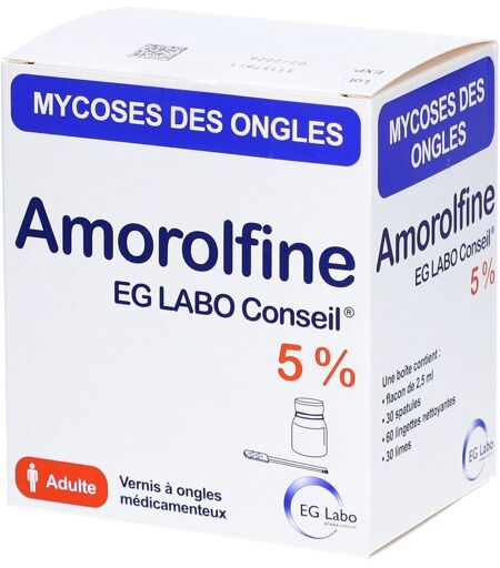 Traitement des mycoses des ongles (affections dues à des champignons).BénéficesForme vernis à onglesAction antifongique locale1 application par semaineTraite jusqu'à 2 ongles atteintsAvec spatules réutilisablesIndicationTraitement des infections unguéales (onychomycoses) causées par des champignons microscopiques chez l’adulte.Effets secondairesÉrythème, eczéma, brûlures de contact.Ingrédients actifsAmorolfine base – 5,00 g pour 100 ml (sous forme de chlorhydrate d’amorolfine 5,57 g)CompositionChlorhydrate d’amorolfine.................................................................................................... 6,400 gQuantité correspondant à amorolfine base............................................................................ 5,000 gPour 100 ml.Mode d'emploiPosologieAppliquer AMOROLFINE EG LABO CONSEIL sur les ongles atteints à la posologie de une à deux fois par semaine.Mode d’administrationPour appliquer le vernis, suivre attentivement les recommandations suivantes :Pour les conditionnements sans accessoires :a) Avant la première application de AMOROLFINE EG LABO CONSEIL, faire une toilette soigneuse des ongles, limer à l'aide d'une lime la zone atteinte de l'ongle (en particulier la surface de l'ongle), aussi complètement que possible.Prendre la précaution de ne pas limer la peau périunguéale.b) Nettoyer la surface de l'ongle et la dégraisser au moyen d'une compresse ou d'un tissu imprégné de dissolvant.c) Appliquer le vernis à l'aide d'une des spatules réutilisables sur la totalité de l'ongle atteint. Nettoyer la spatule réutilisable entre chaque passage d'un ongle à l'autre, afin d'éviter la contamination du vernis. Ne pas essuyer la spatule sur le bord du flacon.d) Il est important de bien nettoyer la spatule à l’aide d’une des lingettes nettoyantes fournies après chaque application avant de la réutiliser pour un autre ongle afin d’éviter la contamination du vernis.e) S’il a été déposé du vernis sur l’extérieur du bouchon lors de la manipulation, il est important de le nettoyer à l’aide d’une des lingettes nettoyantes fournies afin d’éviter d’appliquer ce vernis sur la peau.f) Reboucher hermétiquement le flacon.Répéter l'ensemble des opérations ci-dessus pour chaque ongle atteint.Le traitement doit être conduit sans interruption jusqu'à régénération complète de l'ongle et guérison clinique et mycologique des surfaces atteintes.La durée du traitement est en général de 6 mois pour les ongles des mains et 9 mois pour les ongles des pieds (elle dépend essentiellement de l'intensité, de la localisation de l'infection et de la hauteur de l'atteinte de l'ongle).Précautions d'emploiPas de données spécifiques sur la conservation mentionnées. Fournie en flacon avec 10 spatules. ...