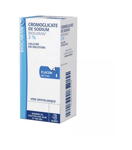 Ce collyre est indiqué en cas de maladie de l'œil d'origine allergique (conjonctivite allergique). N'utilisez jamais CROMOGLICATE DE SODIUM BIOGARAN 2 %, collyre en solution · Si vous êtes allergique au cromoglicate de sodium ou à l'un des autres composants contenus dans ce médicament, mentionnés dans la rubrique 6. Adressez-vous à votre médecin, pharmacien ou votre infirmier/ère avant d’utiliser CROMOGLICATE DE SODIUM BIOGARAN. NE PAS INJECTER, NE PAS AVALER. Ne dépassez pas la posologie recommandée. En l'absence d'amélioration comme en cas de persistance des symptômes, prenez un avis médical. En cas de traitement concomitant par un autre collyre, attendez 15 minutes entre chaque instillation. Rebouchez le flacon après utilisation. Une gêne visuelle passagère peut être ressentie après instillation du collyre en solution. Dans ce cas, attendez la fin des symptômes pour conduire ou utiliser une machine. CROMOGLICATE DE SODIUM BIOGARAN 2 %, collyre en solution contient du chlorure de benzalkonium Ce médicament contient 0,5 mg de chlorure de benzalkonium par flacon de 5 ml de collyre. Le chlorure de benzalkonium peut être absorbé par les lentilles de contact souples et changer leur couleur. Retirez les lentilles de contact avant application et attendez au moins 15 minutes avant de les remettre. Le chlorure de benzalkonium peut également provoquer une irritation des yeux, surtout si vous souffrez du syndrome de l’œil sec ou de troubles de la cornée (couche transparente à l’avant de l’œil). En cas de sensation anormale, de picotements ou de douleur dans les yeux après avoir utilisé ce médicament, contactez votre médecin. Informez votre médecin ou pharmacien si vous utilisez, avez récemment utilisé ou pourriez utiliser tout autre médicament. En cas de traitement concomitant par un autre collyre, attendez 15 minutes entre chaque instillation. Si vous êtes enceinte ou que vous allaitez, si vous pensez être enceinte ou planifiez une grossesse, demandez conseil à votre médecin ou pharmacien avant de prendre ce médicament. Le cromoglicate de sodium passe peu dans la circulation générale. Si vous êtes enceinte ou que vous allaitez, vous pouvez utiliser CROMOGLICATE DE SODIUM BIOGARAN. Posologie · Adulte et enfant : selon la sévérité des symptômes, instillez 1 goutte dans chaque œil, 2 à 6 fois par jour, à intervalles réguliers. Chez l'enfant un avis médical est nécessaire. · Ne dépassez pas la posologie recommandée. Mode et voie d'administration Voie ophtalmique. EN INSTILLATION OCULAIRE. Lavez-vous soigneusement les mains avant de procéder à l'instillation. Instillez 1 goutte de collyre dans le cul de sac conjonctival de l'œil malade en regardant vers le haut, et en tirant légèrement la paupière vers le bas et en évitant le contact de l'embout avec l'œil ou les paupières. Rebouchez le flacon après utilisation. Fréquence d'administration En cas de traitement concomitant par un autre collyre, attendez 15 minutes entre chaque instillation. Durée du traitement... ...