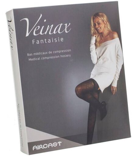 Vos jambes sont-elles lourdes ? Les bas de compression Veinax assurent la recirculation des liquides accumulés dans la partie inférieure des jambes en exerçant une pression sur les tissus et améliorent ainsi la circulation dans les jambes. Ils offrent également une solution en cas de varices.La classe 2 de Veinax équivaut à 15-20mmHg, ce qui correspond à une classe 1 dans les autres marques.IndicationTroubles du système veineux superficiel et facial / Troubles fonctionnels (jambes fatiguées, douloureuses, lourdes) / Varices avec œdème / Thrombophlébite superficielle / Après sclérothérapie / Prévention (voyages et longs déplacements, phlébite, œdème) / Surpoids / Station debout prolongéeApplicationComment choisir sa taille ?Tour de cuisse (C)Taille 1 : 50 – 56 cmTaille 2 : 53 – 59 cmTaille 3 : 56 – 62 cmTaille 4 : 59 – 64 cmTour de mollet (B) Taille 1 : 29 – 32 cmTaille 2 : 32 – 36 cmTaille 3 : 36 – 40 cmTaille 4 : 40 – 44 cm Circonférence cheville (A)Taille 1 : 18 – 20 cmTaille 2 : 20 – 23 cmTaille 3 : 23 – 26 cmTaille 4 : 26 – 29 cm Pour obtenir votre taille, mesurez la circonférence de vos cuisses, de vos mollets et de l’espace juste au-dessus de vos chevilles.Les dimensions ne correspondent pas toutes à la même taille ? Optez pour la taille qui correspond à la circonférence de vos chevilles (A). ...