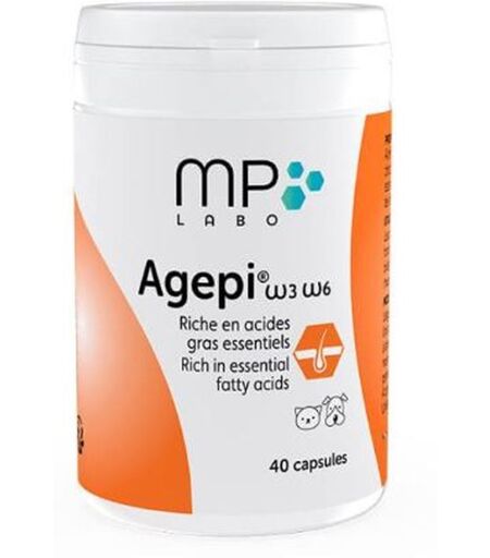 Agepi Omega 3 et 6 est un aliment complémentaire pour chiens et chats, qui permet l'obtention d'un pelage brillant et soyeux, une peau saine et souple (mues, concours, alopécie, poils secs...).Il est également indiqué en complément du traitement des problèmes cutanés (allergies, démangeaisons,...) permettant la diminution des doses de corticoïdes (demandez conseil à votre vétérinaire).Il est important de rappeler que les acides gras essentiels contenus dans l'AGEPI Omega 3 et 6 modifient peu l'apport énergétique et peuvent être utilisés chez les animaux en surpoids.Bénéficesamélioration de la qualité du pelagerégulateur des glandes sébacées : états kérato séborrhéiquesRestaure le film hydrolipidique de la peauSupplémentation nutritionnel en cas de ration ménagère ou manque de lipidesRecommandations nutritionnellesUne capsule pour 10 kg de poids et par jour, à faire avaler directement ou ouverte dans la nourriture.CompositionHuile de bourrache :- acide linoléique ..... 142 mg- acide gamma-linolénique ..... 80 mgHuile de poissons :- EPA ..... 50,5 mg- DHA ..... 33,7 mgGélatine, glycérolConstituants analytiquesProtéine ..... 16,1 %Fibres alimentaires brutes ..... 0,4 %Matières grasses brutes ..... 69,4 %Cendres brutes ..... 0,08 %Additifs par kiloVitamine A (palmitate) ..... 400 UI (soit 444 444 UI/kg)Vitamine E ..... 15 UI (soit 16 666 UI/kg) ...