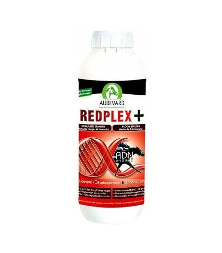 Redplex+ est un complément alimentaire qui a été élaboré pour apporter un soutien nutritionnel adapté aux chevaux à l'entraînement et en compétition, ainsi qu'aux chevaux ayant des baisses de performance.Formule très largeSa formule possède une forte concentration en fer et autres nutriments liés à la synthèse des globules rouges comme la vitamine B12. Elle est également enrichie en extraits d'Angelica sinensis et avec plus de 20 ingrédients concentrés.Mode d'emploi30 à 60 ml par jour. Versez Redplex+ sur l'aliment ou directement dans la bouche du cheval.CompositionMonopropylène glycol, chlorure de potassium, chlorure de magnésium ; Additifs (par litre) : 2b- Substance aromatiques : angélique (Angelica sinensis - ext.) 7 100 ml ; 3a- Vitamines, provitamines et substances à effet analogue : E672 vitamine A 870 000 UI, E671 vitamine D3 120 000 UI, 3a890 chlorure de choline 6 900 mg, acide pantothénique B5 1 670 mg, 3a700 vitamine E 1 200 mg, vitamine B1 1 030 mg, vitamine B2 870 mg, 3a831 vitamine B6 270 mg, 3a316 acide folique 245 mg, E300 vitamine C 200 mg, vitamine B12 4 mg, biotine 0,5 mg ; 3b- Oligo-éléments : E1 fer (chélate et sulfate) 11 000 mg, E6 zinc (chélate et sulfate) 3 850 mg, E4 cuivre (chélate et sulfate) 1 330 mg, E5 manganèse (chélate et sulfate) 1 330 mg, 3b305 cobalt (sulfate) 70 mg, E8-3b8.10 sélénium (Selplex et sélénite) 23 mg, E2 iode (iodure de potassium) 10 mg.- Additifs technologiques : E 310 Gallate de propyle 60 mg, E320 BHA 30 mg - Constituants analytiques : humidité 91,1 %, protéines brutes 1,4 %, matières grasses brutes 0,3 %, cendres brutes 3,7 %, cellulose brute 0,01 %, potassium 0,35 %, magnésium 0,07 %. ...