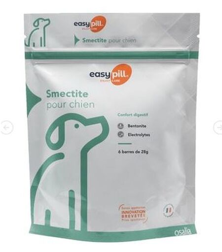 Easypill Chien Smectite est un complément alimentaire appétent qui permet de favoriser le confort digestif et de réduire les risques de malabsorption intestinale aiguë chez les chiens adultes. Easypill Smectite Chien contient de l'argile verte surfine. Elle contribue à diminuer l'intensité des diarrhées, à adsorber les toxines, à réduire la déshydratation et à protéger physiquement la muqueuse. La formulation spécifique très appétente d'Easypill Smectite favorise une prise spontanée par l'animal.Que contiennent les Easypill Chien Smectite ? Puis-je donner du smecta à mon chien ?EasyPill Chat Smectite contient de l'argile verte surfine.Comme le SMECTA pour humain, elle contribue à diminuer l'intensité des diarrhées, à absorber les toxines, à réduire la déshydratation et à protèger physiologiquement la muqueuse.La formulation spécifique très appétente d'EasyPill Chien Smectite favorise une prise spontanée par l'animal.Il est donc préférable d'administrer un médicament adapté à votre chien.Pourquoi utiliser Easypill Smectite Chien ?Grâce à son excellente appétence, Easypill s'administre en prise spontanée, comme une friandise.Les animaux domestiques ont un goût et un odorat très développés. Ceci rend souvent très contraignant l'administration de substances actives par voie orale.Grâce au concept EasyPill Chien Smectite, les substances actives sont intégrées dans une boulette spécifiquement adaptée au goût du chien.L'excellente appétence d'Easypill Chien Smectite permet ainsi généralement une prise spontanée par l'animal. Les boulettes d'EasyPill Chien Smectite sont hypocaloriques et hypoallergéniques, elles conviennent à tous les animaux, même les plus sensibles.Recommandations nutritionnellesChaque barre d'Easypill Smectite Chien est prédécoupée en 7 portions de 4 g.Distribuer pendant 7 jours une quantité adaptée au poids de l'animal :Chien < 12 kg : 1 portion 2 fois par jour (soit 2 barres pour 7 jours)Chien de 12 kg à 24 kg : 2 portions 2 fois par jour (soit 4 barres pour 7 jours)Chien de > 24 kg : 3 portions 2 fois par jour (soit 6 barres pour 7 jours)Laisser en permanence de l'eau à disposition de l'animal.EasyPill Chien Smectite à une conservation de 24 mois à compter de la date de fabrication.CompositionProtéines hydrolysées de porc et volailles, Glycérine, Monopropylène glycol, Amidon de riz prégélatinisé, Sous-produit de porc, Graisse de canard, Chlorure de potassium 2 %, Chlorure de sodium 1.5 %.Constituants analytiquesProtéines brutes : 16,7% - Matières grasses brutes : 9,3% - Cendres brutes : 30,9% - Cellulose brute : 0,8% - Humidité : 23,4%Additifs par kiloBentonite 285 mg/kg - Lécithine de soja 55 mg/kg - Conservateurs et antioxigènes ...