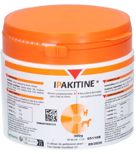Chez les chiens et chats atteints d’insuffisance rénale chronique, une alimentation pauvre en phosphore est essentielle. Grâce à Vetoquinol Ipakitine, un chélateur de phosphate alimentaire, votre compagnon peut continuer à savourer ses repas habituels sans suivre un régime strict. Il suffit d’ajouter la poudre à sa nourriture quotidienne pour l’aider à se sentir mieux au quotidien.Cet aliment complémentaire agit efficacement en réduisant l’absorption du phosphore, soutenant ainsi la fonction rénale de manière naturelle. Enrichi en chitosan, il aide également à capter et à éliminer les toxines urémiques au niveau digestif, améliorant le confort et la qualité de vie de votre animal.Vetoquinol Ipakitine est recommandé en cas d’insuffisance rénale chronique, y compris sur le long terme. Avant de commencer l’administration, il est toutefois conseillé de consulter un vétérinaire. Chez les animaux plus âgés, cet aliment complémentaire peut également être associé à une alimentation rénale adaptée ou à des inhibiteurs de l’enzyme de conversion de l’angiotensine pour un soutien optimal.Recommandations nutritionnellesAdministrer oralement 1 g d'Ipakitine à l'aide de la cuillère fournie pour 5 kg de poids corporel deux fois par jour pendant les repas.Poids du chat ou du chienNombre de cuillères par jour3-5 kg210 kg415 kg620 kg8Conserver au frais et au sec. Veillez à toujours laisser de l'eau fraîche à la disposition de votre animal.CompositionLactose, carbonate de calcium, chitosan, protéine de soja hydrolysée.Constituants analytiquesprotéines brutes 4.0 %graisses brutes 0.5 %fibres brutes 0.5 %cendres brutes 10.0 %calcium 3.7 %phosphore 0.01 %humidité 2.5 %potassium 0.02 %sodium 0.01 %Additifs par kiloSans additifs ...