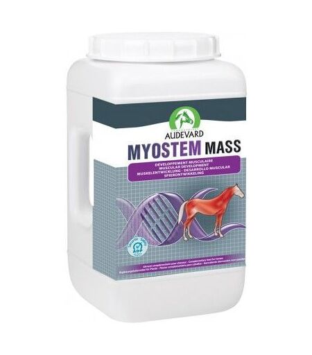 Myostem Mass est un aliment complémentaire sous forme de granulés élaboré pour apporter un soutien nutritionnel au développement musculaire. Il convient aux chevaux à l'entraînement, aux chevaux âgés ou manquant d'état et aux poulains en croissance.Formule riche en acides aminésSa formule offre un apport calculé en acides aminés, souvent apportés en quantités insuffisantes dans l'alimentation.Mode d'emploi Cheval adulte : 4 mesures par jour, pendant au moins 3 semaines. Poulain : 1 à 2 mesure(s) par jour, pendant au moins 3 semaines. Administrez Myostem Mass dans les heures suivant l'effort pour qu'il soit assimilé au moment de la synthèse protéique.CompositionPour 1 kg : Matières premières : protéines de pois, fenugrec (Trigonella foenum-graecum), extrait de parois de levures, lactosérum. Additifs : Acides aminés : 3.3.1 thréonine 18,7 g, 3.2.3 lysine 15 g, valine 12,5 g, 3C301 méthionine 8 g, isoleucine 5 g. Substances aromatiques : leucine 25 g, phénylalanine 12,5 g, histidine 10 g. Constituants analytiques : humidité > 10 %, protéines brutes 70 %, cendres brutes 8 %, cellulose brute 5 %, matières grasses brutes 1 %. ...