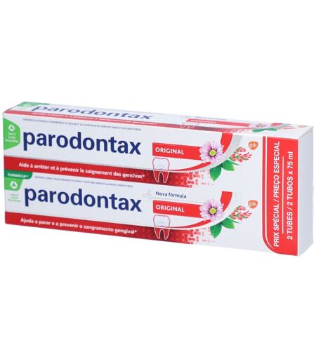 Les bactéries de la plaque dentaire qui se déposent sur le liseré gingival peuvent attaquer la gencive. Cela peut avoir pour conséquence la gingivite ou pire, la parodontite.C'est pourquoi il est primordial de bien enlever la plaque régulièrement lors du brossage des dents, à l'aide de substances spéciales contenues dans un dentifrice.Ces substances spéciales dans les dentifrices sont entre autres le fluorure, les sels minéraux (bicarbonate) ou des extraits végétaux.Les dentifrices standard ne contiennent le plus souvent que 25% env. de substances spéciales. parodontax au fluorure en contient par contre une part largement supérieure avec 70 %. parodontax au fluorure nettoie les dents en profondeur, réduit les bactéries nocives et aide à prévenir efficacement les problèmes de gencive.Bénéfices L'utilisation quotidienne de parodontax au fluorure:Soigne les gencives irritéesAide à prévenir les saignements de la genciveNettoie en profondeur sans attaquer l'émail (moins abrasif)Contient 1 400 ppm de fluorure de sodium pour la prophylaxie des cariesConseils d'utilisation S'utilise quotidiennement.Composition Sodium Bicarbonate, Aqua, Glycerin, Cocamidopropyl Betaine, Alcohol, Krameria Triandra (Ratanhia), Mentha Piperita, Mentha Arvensis, Echinacea Purpurea, Commiphora Myrrha, Chamomilla Recutita, Salvia Officinalis (Sauge), Sodium Fluoride, Sodium Benzoate, Xanthan Gum, Sodium Saccharin, Limonene, CI 77491.Conditionnement Tube 75 ml x2 ...