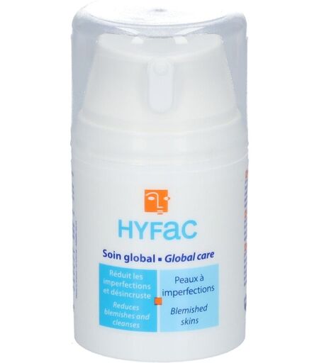 Le soin global HYFAC « 4 en 1 » favorise l’élimination des imperfections (boutons d’acné, comédons, microkystes), hydrate et matifie. Sa formule combine différents actifs dont les propriétés scientifiquement reconnues agissent en synergie sur les peaux à tendance acnéique. Les acides de fruits (AHA) désincrustent les pores sans agresser l’épiderme et préviennent la formation des imperfections. Excellente base de maquillage, il purifie et laisse la peau nette, hydratée et matifiée. Bénéfices Elimine les impuretés et les comédons Unifie le teint Limite les boutons inflammatoires Hydratante et matifie Parfum fraicheur Indications Soin global pour les peaux à tendance acnéiques. Conseils d'utilisation Appliquer matin et/ou soir sur le visage préalablement nettoyé avec le gel nettoyant purifiant HYFAC, et parfaitement séché. Ce soin « 4 en 1 » convient comme base de maquillage. Le soin global HYFAC peut être utilisé en monothérapie, ou en complément des traitements contre l’acné. A l’arrêt du traitement contre l’acné, il est conseillé de continuer à utiliser le soin global HYFAC comme solution d’entretien afin de prolonger l’efficacité du traitement. Utilisé seul, il est recommandé pour le soin des peaux à tendance acnéique comme crème de jour et/ou de nuit. Son efficacité a été démontrée : il contribue à éliminer les boutons rouges et blancs, les comédons (points noirs) et les microkystes. Composition AQUA (WATER), CETEARYL ETHYLHEXANOATE, DI C12-13 ALKYL MALATE, GLYCOLIC ACID, CYCLOPENTASILOXANE, GLYCERIN, STEARETH-2, STEARETH-21, NYLON 12, CYCLOHEXASILOXANE, CETYL ALCOHOL, POLYACRYLAMIDE, SODIUM HYDROXIDE, C13-14 ISOPARAFFIN, DIAZOLIDINYL UREA, DIMETHICONOL, PIROCTONE OLAMINE, PARFUM (FRAGRANCE), LAURETH-7, XANTHAN GUM. Conditionnement Flacon-pompe 40 ml ...