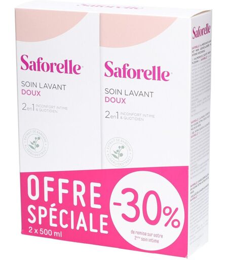 Le Soin Lavant Doux Saforelle a été spécialement formulé pour les peaux sensibles ou irritées. Il nettoie en douceur et calme irritations et sensations d’inconfort.Son pH alcalin doux et sa formulation enrichie en Bardane et agent surgras en font un soin particulièrement adapté à un usage quotidien respectant l’équilibre naturel de la peau.Le produit d’hygiène intime et corporel de référence recommandé par les gynécologues depuis plus de 20 ans.BénéficesSpécial peaux sensibles ou irritéesNettoie en douceurCalme les irritations et sensations d’inconfortAdapté à un usage quotidienConseils d'utilisationLe Soin Lavant Doux Saforelle s’utilise comme un savon liquide en usage externe. Faire mousser puis rincer à l’eau claire.Formulé pour un usage quotidien tout en douceur, une à deux fois par jour, pour les peaux sensibles, le Soin Lavant Doux Saforelle est aussi recommandé en cas de désagréments intimes (irritations, sensations d’inconfort…).CompositionAqua, cocamidopropyl betaine, Cocamide dea, Sodium chloride, Peg-6 caprylic/capric glycerides, parfum, Citronellol, Coumarin, Geraniol, Limonene, Linalool, Propylene glycol, Stearamine oxide, Octoxynol-12, Lavandula angustifolia oil, tetrasodium edta, polysorbate 20, Sodium hydroxide, Arctrium lappa root extract, Dimethyl stearamine.Conditionnement2 tubes 500 ml ...