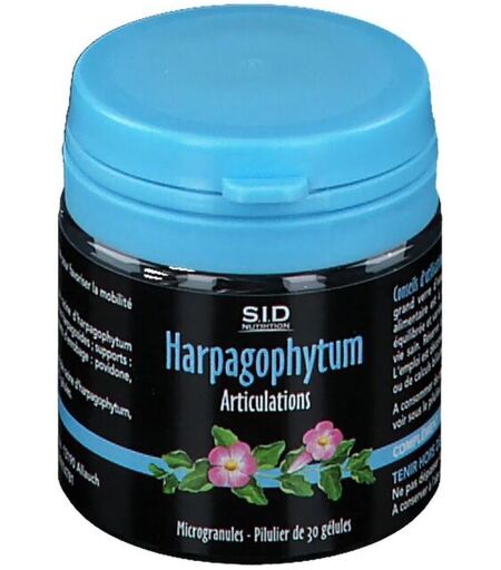 Complément alimentaire à utiliser dans le cadre d’une alimentation variée, équilibrée et d’un mode de vie sain.Gélule de complément alimentaire à visée articulaire.Confort articulaire. Adulte et enfant de plus de 12 ans.Composition:Extrait de racine d'harpagophytum (Harpagophytum procumbens) 200 mg, support cellulose microcristalline, xylitol, agents d'enrobage povidone et gomme laque, enveloppe gélatine, excipients qsp une gélule composée de microgranules enrobées.Valeur nutritionnelle: Pour 1 géluleExtrait de racine d'harpagophytum200 mg Conseil d'utilisation:1 à 2 gélules par jour à avaler avec un grand verre d'eau en dehors des repas.Précautions d'emploi:Réservé à l'adulte et à l'enfant de plus de 12 ans. Ce produit est à conserver à l'abri de la lumière, de la chaleur et de l'humidité. Tenir hors de portée des enfants. Ne pas dépasser la dose recommandée.Poids net:30 gélulesFabricant:S.I.D NutritionAvenue de Provence13190 Allauch ...