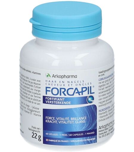 Complément alimentaire à utiliser dans le cadre d’une alimentation variée, équilibrée, d’un mode de vie sain. Des cheveux ternes et sans volume ? Des cheveux et des ongles cassants ? Forcapil®, formule fortifiante est une association d’actifs qui apporte Force, Vitalité et Brillance à vos cheveux et vos ongles. Composition: L-cystine, Agent de charge: cellulose, L-méthionine, Vitamine B5, Oxyde de zinc, Antiagglomérant: stéarate de magnésium, Vitamine B6, Vitamine D3, Vitamine B8 (Biotine), Vitamine B9, Enveloppe: gélatine. Valeur nutritionelle: Pour 1 comprimé % AJR* Vitamine B5 18 mg 300 % Vitamine B6 2 mg 147 % Vitamine B9 200 µg 100 % Vitamine D3 5 µg 100 % Vitamine B8 450 µg 900 % Zinc 15 mg 150 % L-Cystine 300 mg L-Méthionine 100 mg *Apport journalier de référence Conseil d'utilisation: Prendre 2 gélules le matin pendant 2 à 4 mois. Avaler les gélules avec un grand verre d'eau au cours du petit-déjeuner. Précautions d'emploi: Pour être en phase avec la durée du cycle du cheveu, il est recommandé une durée d’utilisation d’au moins 3 mois, renouvelable plusieurs fois durant l’année, notamment aux changements de saison. Convient aussi aux femmes enceintes à partir du 2ème trimestre de grossesse et aux femmes allaitantes. Ne pas laisser à la portée des jeunes enfants. Poids net: 22 g = 60 capsules Fabricant: Arkopharma 13 Parc de la Noire Epine 1300 WAVRE ...