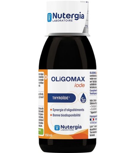 Complément alimentaire à utiliser dans le cadre d’une alimentation variée, équilibrée, d’un mode de vie sain.Complément alimentaire à base d'eau de mer des Salins du Midi et extrait français de lithothamne, sources de minéraux et oligoéléments.Formule améliorée pour une meilleure tolérance.OLiGOMAX Iode pourra être conseillé lors de fatigue générale, et pour une bonne fonction de la thyroïde.Demandez conseil à votre thérapeute ou pharmacien. Composition: Solution aqueuse d’oligoéléments (eau filtrée, eau de mer concentrée désodée, extrait standardisé de lithothamne- Phymatolithon calcareum Pall. gluconates de zinc, de fer et de cuivre, chlorure de chrome, iodure de potassium, sulfate de manganèse, sélénite et molybdate de sodium), conservateur : sorbate de potassium ; correcteur d’acidité : hydroxyde de potassium.Valeur nutritionelle: Pour 5 ml% AJR*Iode150 µg100 %Sélénium14 µg25 %*Apport journalier de référence Conseil d'utilisation: 5 ml par jour à diluer dans 1 verre d’eau (150 ml).Précautions d'emploi: Ne pas dépasser la dose journalière conseillée. Conserver hors de portée des enfants et à T° < 25° C.Poids net: 150 mlFabricant: NutergiaB.P.5212700 Capdenac ...