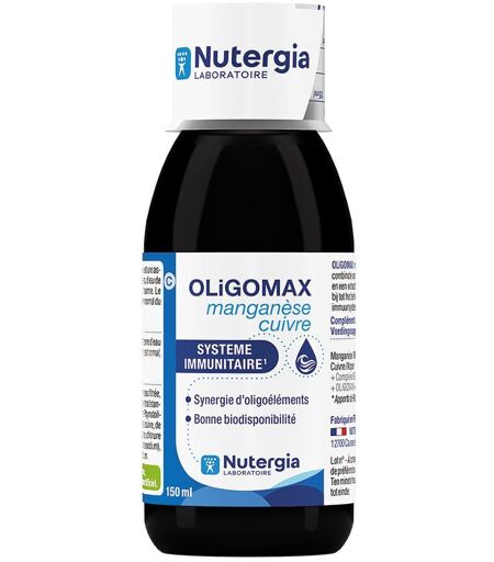 Complément alimentaire à utiliser dans le cadre d'une alimentation variée, équilibrée et d'un mode de vie sain.OLiGOMAX Manganèse - Cuivre associe les minéraux et oligoéléments de l'eau de mer et du lithothamne, algue rouge récoltée sur les côtes françaises, à des oligoéléments sélectionnés.La formule est riche en manganèse et cuivre. Le manganèse contribue à protéger les cellules contre le stress oxydatif et le cuivre participe au fonctionnement du système immunitaire.OLiGOMAX Manganèse - Cuivre pourra être conseillé lors de la période hivernale ou lors de périodes à risque.Composition:Solution aqueuse d'oligoéléments (eau filtrée, eau de mer concentrée désodée, extrait standardisé de lithothamne - Phymatolithon calcareum Pall., gluconates de cuivre, de zinc et de fer, chlorure de chrome, sulfate de manganèse, sélénite et molybdate de sodium), conservateur : sorbate de potassium.Valeurs nutritionnelles:CompositionPour 5 mlVNR*Manganèse2 mg100 %Cuivre1 mg100 %*Valeurs nutritionnelles de RéférencesConseil d'utilisation:5 ml par jour à diluer dans 1 verre d'eau (150 ml).Précautions d'emploi:Ne pas dépasser la dose journalière conseillée. Conserver hors de portée des enfants et à T° < 25° C.Poids net:150 mlFabricant:Laboratoires NutergiaB.P. 5212700 Capdenac ...