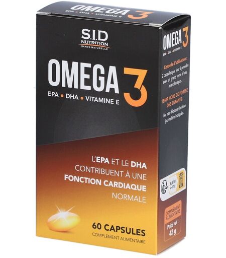 Complément alimentaire à utiliser dans le cadre d’une alimentation variée, équilibrée et d’un mode de vie sain.Complément alimentaire à base d’huile de poissons concentrée en oméga 3, avec un apport en EPA et DHA qui contribuent à une fonction cardiaque normale. La vitamine E aide à protéger les cellules contre le stress oxydatif. L’effet bénéfique est obtenu par la consommation journalière de 250 mg d’EPA + DHA.IngrédientsHuile de POISSONS (MOLLUSQUES) concentrée en acides gras titrés à 90 % en oméga 3 (dont 48 % EPA et 32 % DHA), extrait riche en tocophérols, antioxydant : vitamine E d’origine végétale ; humectant : glycérol ; gélatine ; eau.Allergènes : Poisson, Mollusque.Valeurs nutritionnelles Pour 2 capsules% VNR* Huile de poissons1000 mg– dont Oméga 3900 mg– dont EPA480 mg– dont DHA320 mg– Vitamine E (α-tocophérol)3,8 mg32 % *VNR = Valeurs Nutritionnelles de RéférenceConseils d'utilisation2 capsules par jour avec un grand verre d’eau, avant le repas.Précautions d'emploiTenir hors de portée des enfants. Ne pas dépasser la dose recommandée. À conserver à l’abri de la lumière, de la chaleur et de l’humidité. Recommandé de consulter un professionnel de santé avant utilisation chez les femmes enceintes ou allaitantes.Poids net60 capsules = 42 gAdresse du FabricantSID NutritionAvenue de Provence13190 AllauchFrance ...